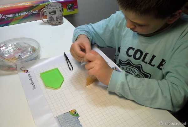 - Выложите нужные по схеме кристаллы на тарелочку и при помощи пинцета аккуратно поместите нужный камушек на нужную клеточку. Слегка надавите на него, чтобы он закрепился на клейкой основе.