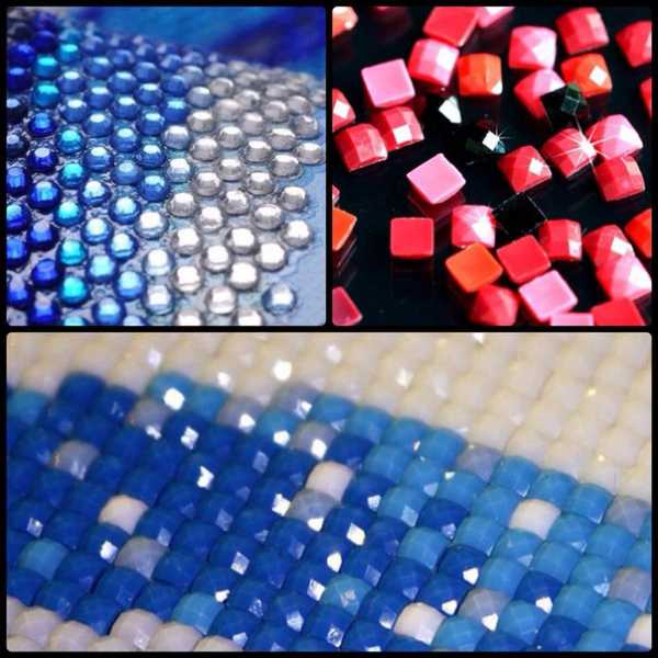 Перед тем, как браться за картину, нужно с точностью определиться, что именно хотелось бы получить. Это касается самой формы страз. Они бывают квадратные и круглые. Именно от них будет зависеть общий вид картины. Круглые стразы чаще всего изготавливаются из акрила и очень похожи на стразы Сваровси. Квадратные стразы изготавливаются из специальной смолы. Они хорошо блестят и отражают свет. Для одной и второй техники алмазной картины можно использовать любые стразы. Техника алмазной мозаики в данном случае может быть только удобством или просто привычной работой.