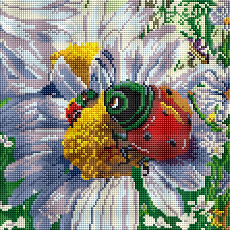 В набор входит: холст или основа с нанесенной цветной схемой и клеевым покрытием; пронумерованные и расфасованные по пакетикам стразы; инструкция; пинцет или магнитный карандаш, которым вы будете выкладывать стразы на основу; чашечка для страз.
