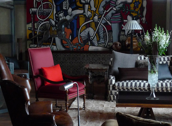 По бокам от зеркала — картина Михаила Тихонова и китайская статуя. Вращающееся кресло 1960-х годов — скандинавское. Бронзовая скульптура Ботеро стоит на низком столике. диванная ткань Sahco; черная ткань для диванных подушек, Lelièvre.