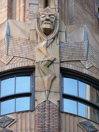 В Чикаго, втором центре развития нового стиля, в период с 1927 по 1930 гг. фирмы «Холаберт и Рут», а также «Грехем, Андерсон, Пробст и Уайт» возводят по пять уступчатых небоскребов в неоархаическом, мезоамериканском ар-деко. Монументальные, расположенные друг напротив друга, они были призваны конкурировать и с достижениями неоклассики 1900-1910-х, и между собой. Они не могли не восхищать, и так стремились работать и советские архитекторы 1930-х. Более того, неоархаизм ар-деко обрел в США еще один, национальный источник вдохновения – кирпичные башни Р. Уалкера в Нью-Йорке восходили к блистательной эстетике скал Долины монументов (таковы, например, Вестерн Юнион билдинг, 1930 и Эй-Ти-энд-Ти Лонг Дистанс билдинг, 1932). Уступчатые и покрытые барельефами, башни ар-деко казались выросшими до небес творениями Ацтеков и Майя. [2]Дейли Ньюз билдинг в Чикаго, портал главного фасада.