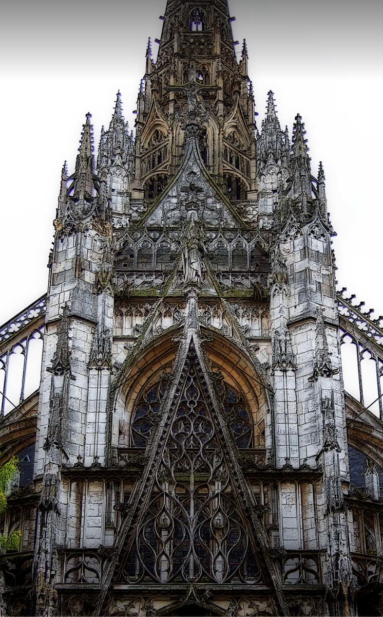 Рис. 18: Богато украшенное розовое окно на портале Сент-Этьен на западной стороне собора. Обратите внимание на элементы Trefoil и Quatrefoil, используемые в дизайне оконных сегментов.Также обратите внимание на элементы дизайна на вершине и скульптурную фигуру на фронтоне.