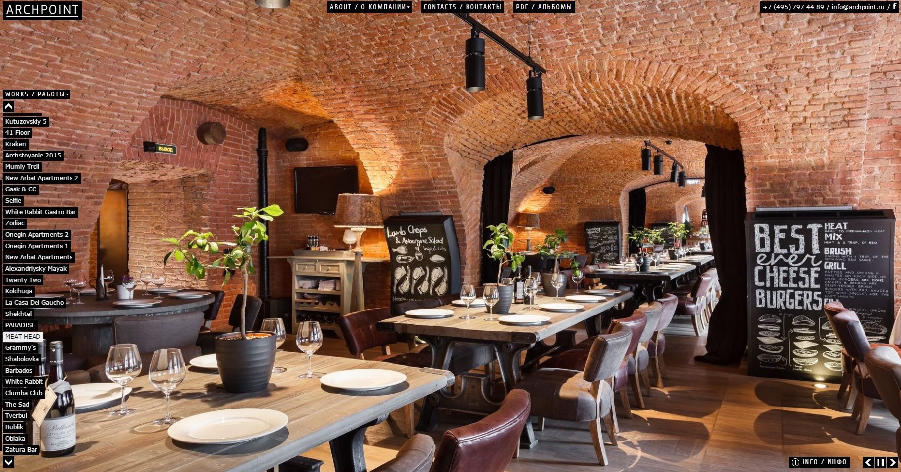 Креативная команда архитекторов и дизайнеров «АрхПоинт» создала интерьеры ресторанов: The Toy, Prscco bar, Mushrooms, Parka, «Чиполлино», La Casa, Poison, Mon cafe, «Бэд Кафе», «Затурабар», «Клумба»; ночных клубов First, «Эгоист голд», «Шамбала»; казино «Бархат» и «Баккара».