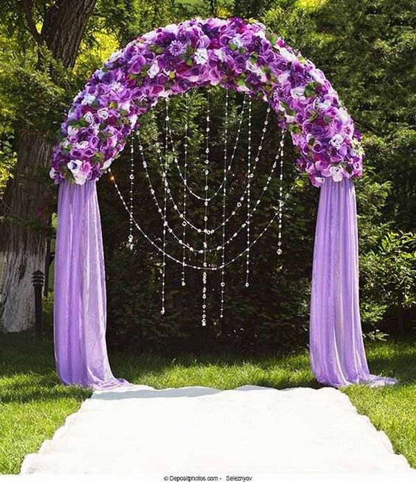 Как вариант, может быть выбрана правильная круглая форма арки, которая олицетворяет благословение и защиту небес. По контуру она может быть задрапирована ветвями лавра, если, к примеру, выбран греческий стиль свадебного торжества.