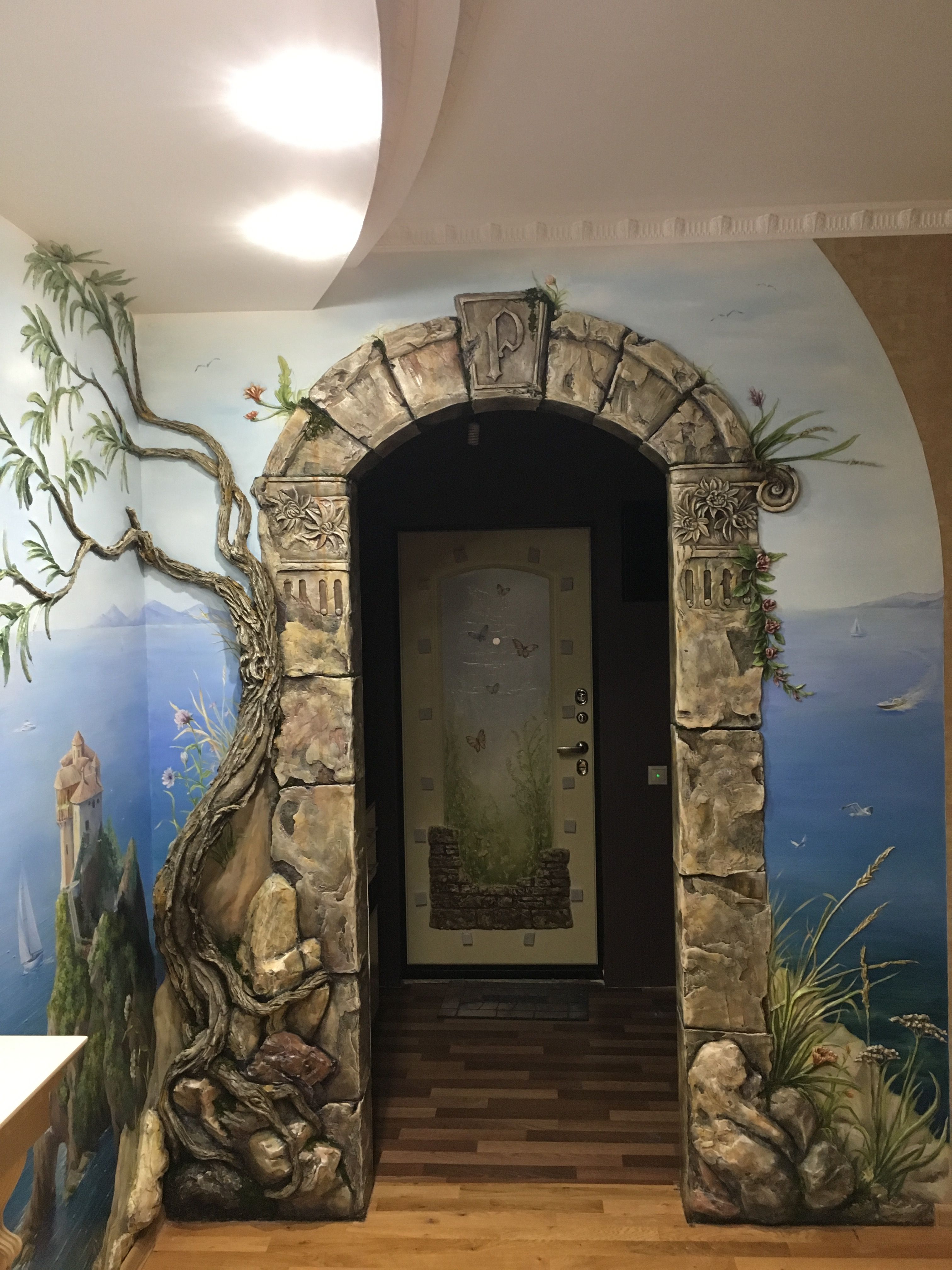 Визуальное расширение пространства важно правильно оформить, чтобы иметь в результате интересный объект. Один только декоративный камень создает ощущение незавершенности. Если арку, ведущую в прихожую или в детскую, стилизуют под вход в пещеру, туннель или пасть экзотического ящера, дополнительным способом декорирования в таком случае выступают свет и растения. Без растительности трудно сотворить арку, которая послужит туннелем в подводный мир.