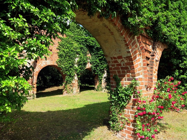 Дверные порталы в раме шероховатого камня создают «замковый» эффект. Производит впечатление часть арки с «утратами», где проглядывает кирпичная или разнокалиберная каменная кладка.