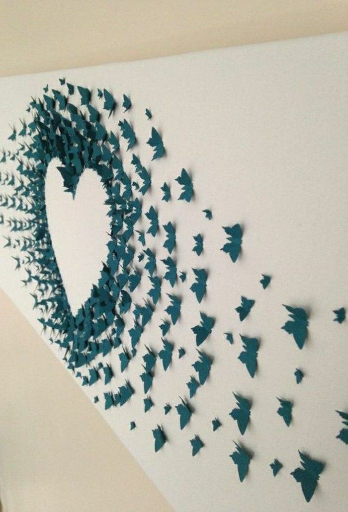 Таких бабочек лучше всего располагать на стене стайками, перелетающими из одного конца в другой. Красиво будет смотреться и сердечко из мотыльков или большое насекомое, сделанное из маленьких деталей. Перед помещением на стену, следует нанести карандашом будущий узор, а затем по нему прикреплять готовых мотыльков.