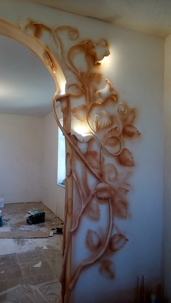 Работа выполняется с использованием гладкой декоративной штукатурки и гипсовой шпатлевки при помощи мастихина.