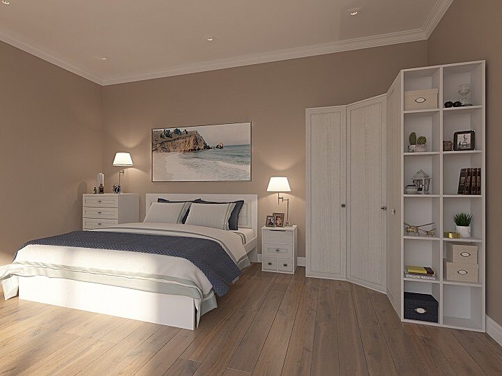 - Мебель светлых тонов не выглядит громоздкой, поэтому ею можно обставить небольшие помещения. В большой спальне она подчеркнет простор.