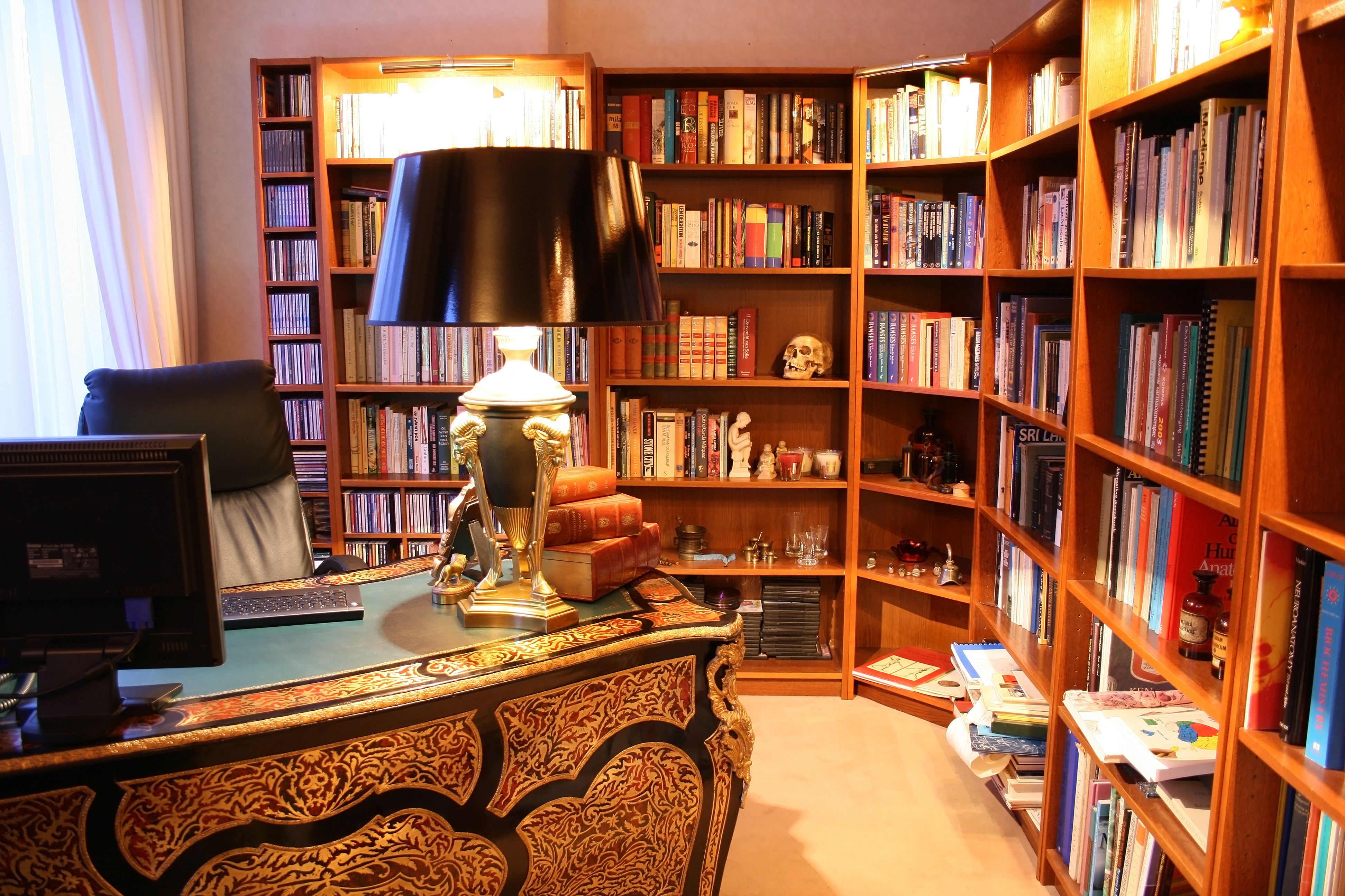 Традиционный строгий декор отлично смотрится в домашней библиотеке.