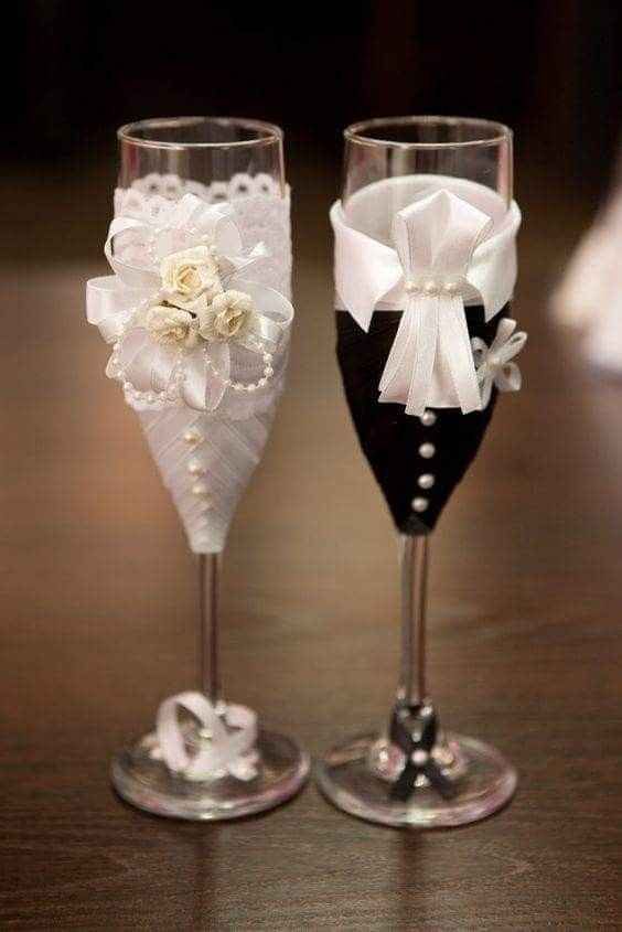 Прекрасно смотрятся как лаконичные бокалы, украшенные исключительно лепестками и изящной лентой на ножке, так и торжественные атрибуты, щедро декорированные стразами, бусинами, кружевом, надписями или камнями.
