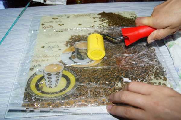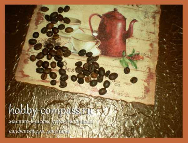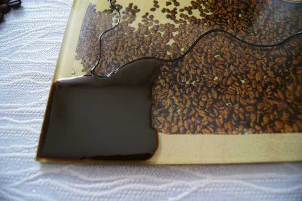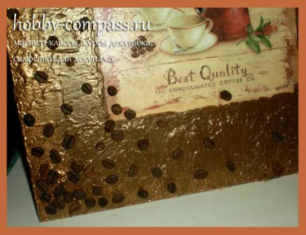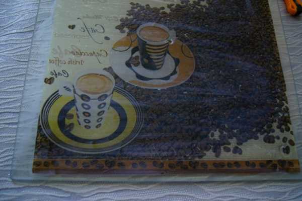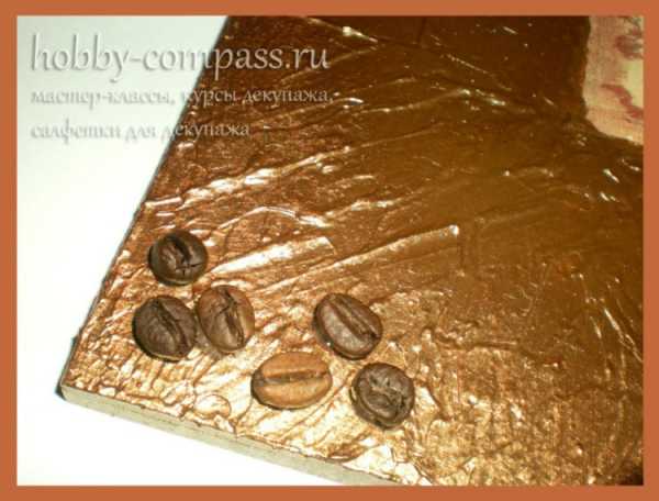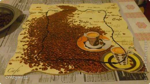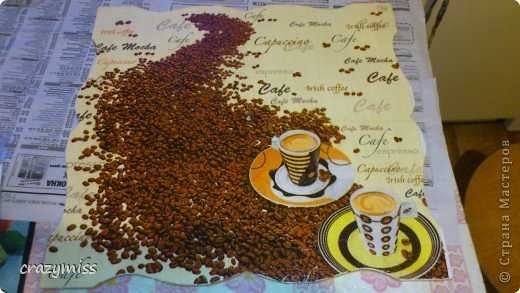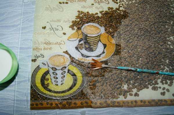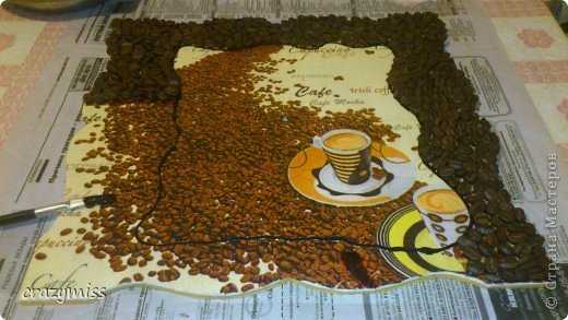 8. Когда таким образом заполнено все желаемое пространство, мы оставляем работу сушиться. Через часик все уже будет хорошо держаться. Если же у вас имеются контуры других цветов, то можно обвести и детали рисунка, чтоб выделить их. Кофейные зерна лаком не покрываются! Так они будут выглядеть натуральнее и будет чувстватся их аромат! А лак только всё испортит, перебив запах и еще придаст искусственный блеск.