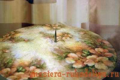 Если вы все-таки решили делать поделку с деревянной заготовкой, то надо знать некоторые особенность работы. Например, изначально надо загрунтовать всю поверхность изделия. После чего закрасить все акриловой краской белого цвета. Только потом наклеиваем салфетку, но на этот раз рисунком к себе. Тщательно разравниваем салфетку по поверхности и закрепляем лаком. Остальные действия проделываем также, как и для стеклянных часов своими руками.