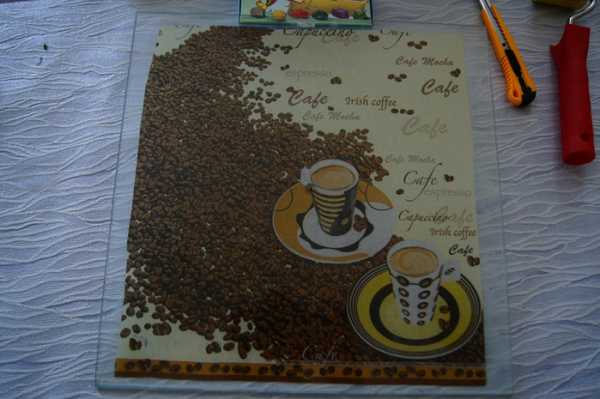 После того как мы все подготовили, начинаем работать со стеклом. Чтобы лучше приклеилась наша салфетка, хорошо обезжириваем стекло с двух сторон. Для удобства работы необходимо обрезать салфетку под размер стекла.
