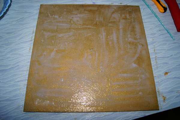 5. Краску очень удобно наносить кусочком губки, для этого равномерно мы «прочпокиваем» всю поверхность, после чего — сушим. Если после высыхания нам вдруг кажется, что есть еще просветы, то покрываем краской и второй раз, уже для верности. Здесь автор второй слой сделала золотой краскою.