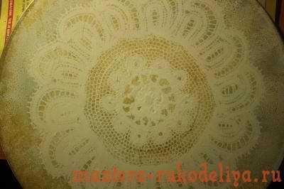 Как только мы приклеили нашу замечательную салфетку, даем ей хорошенько просохнуть. Затем всю поверхность салфетки нужно покрыть тонким слоем лака из акрила. Красить лаком надо легкими движениями, чтобы не повредить салфетку. А когда лак хорошо высохнет, можете наложить краску.
