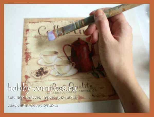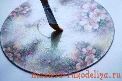 5. Теперь приклеенную салфетку покрываем двумя слоями акрилового лака, хорошо просушивая каждый слой.