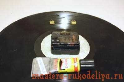 10. Автор советует при отсутствии стекла делать часы на чем угодно. Например, на фанерной заготовке, или на виниловой пластинке…Конечно, и выглядеть они будут немножко по- другому, однако все равно очень необычно, и порадуют Вас и Ваших близких. Если же совсем ничего нет, то купить можно не дорогую разделочную доску, просверлить отверстие под механизм и оформлять! А ненужная дырочка, которая есть в такой доске изначально, закроется впоследствии салфеткой и кофе.