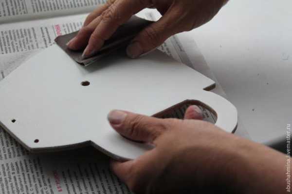 Осматриваю заготовку, ищу дефекты и шпатлевкой устраняю их. После высыхания шкурю. На моей заготовке дополнительной было заказано мастеру 3 небольших отверстия по низу- для пущей красоты, для декору 🙂