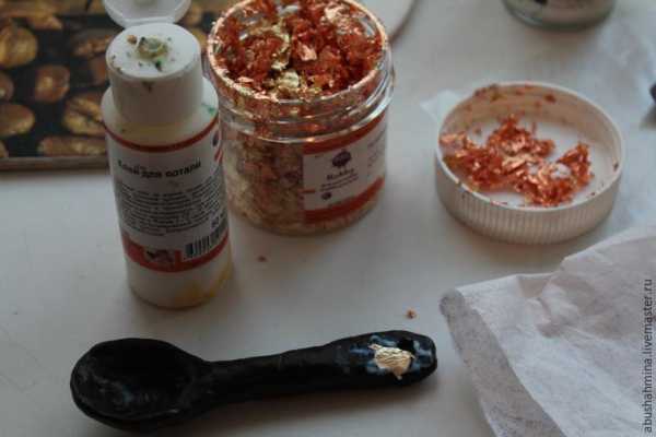 Декрирую ложечку золотом. Поталь в хлопьях очень удобна. Здесь на фото я только начала процесс медитации (=приклеивания хлопьев). Одновременно крошками золота я покрыла 4 самых крупных зерна из моей упаковки. Готовый результат чуть ниже!