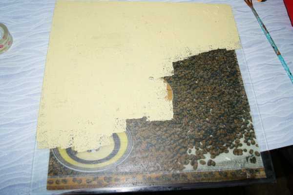 Подождав 10-20 минут, можно приступать к декору зернышками. Для этого маленький кусочек покрыть витражной краской и аккуратно уложить на него кофе в произвольном порядке, подвигать друг к другу зубочисткой.
