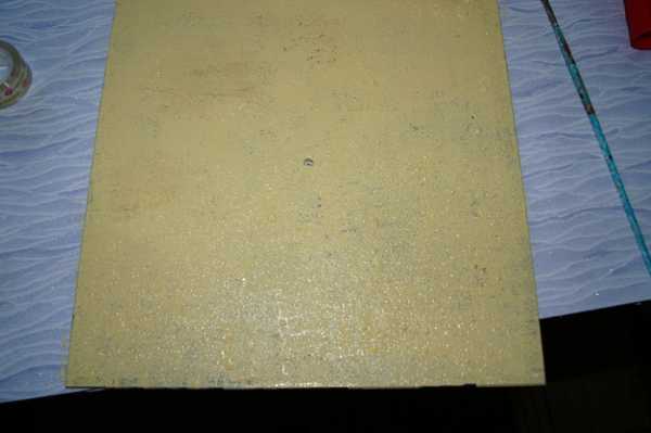 — Окрасить фон губкой. На примере показан золотистый акрил. Подождать высыхания.