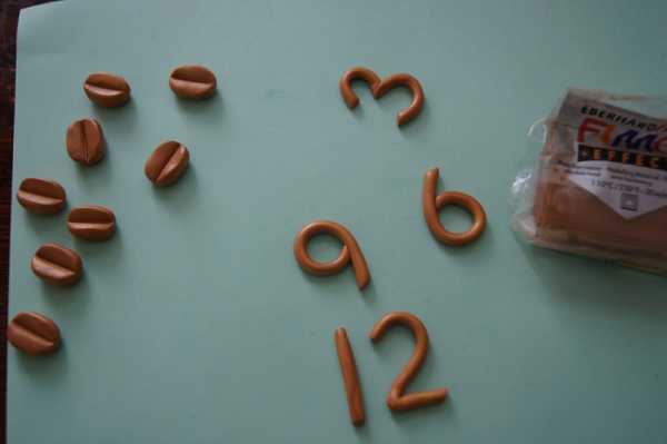 9. Далее — делаем циферблат из подручных средств. Можно просто поставить жирные точки контуром, можно приклеить зерна кофе (можно покрасить их в любой цвет акриловой краской и покрыть лаком), именно в этих авторских часах цифры с остальными делениями сделаны из запекаемой пластики фирмы Ф?МО.
