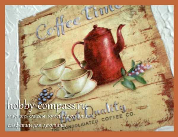 Я подобрала вот такую салфетку: сплошной кофе с небольшой надписью. Мою заготовку четверть салфетки покрывает не польностью, ручку на большой чашке я доклею чуть позже.