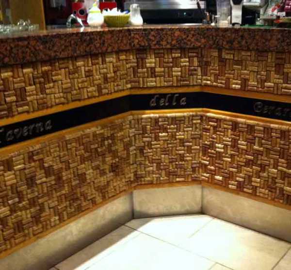 Эта барная стойка итальянского кафе Taverna della Cerardenga отделана винными «затычками» – благодаря разному цвету пробок достигнут эффект плетения, очень красивое применение вещам, которые чаще всего просто выбрасывают.