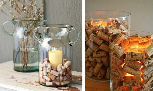 Пожалуй, самый простой вариант использования винных пробок в интерьере — декор подсвечников. Насыпьте в прозрачный сосуд пробки, поставьте внутрь свечку, и красивый аксессуар готов.