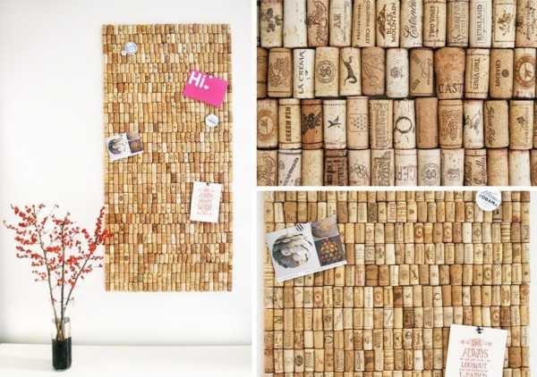 Это также несложная и полезная поделка – доска-напоминалка. Основа из влагоустойчивого оргалита или любой деревянной дощечки, фанеры или картона что дома найдется. Сначала приклеивайте на основание рамку (можно использовать клей Момент). Располагать пробки можно по две, попеременно вдоль и поперек – тогда получится шахматный узор, либо в любом другом порядке, который вам понравится. Можете сначала уложить их на основе с рамкой без клея, чтобы посмотреть, как это будет выглядеть, и только потом приклеивать. Потом к оборотной стороне основы приделайте петли и повесьте вашу поделку на стену. К ней очень удобно булавками прикалывать бумажки с напоминаниями. Если вы любитель цветовых решений, можете покрасить кружочки пробок в цвета радуги или любой цвет, подходящий к интерьеру, и покрыть лаком.