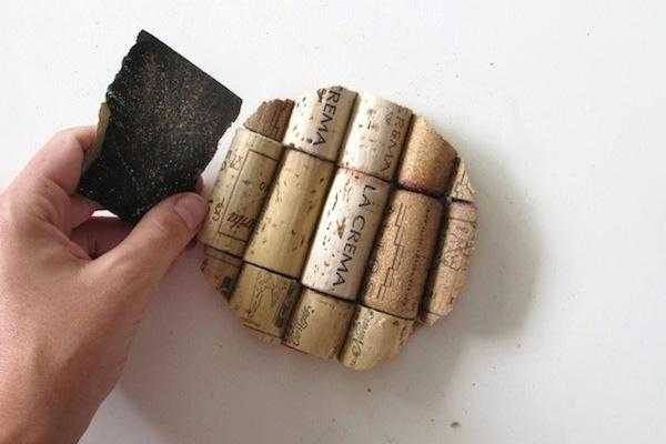 Процесс изготовления максимально прост – на гибкую или твердую основу наклеиваются клеевым пистолетом или жидкими гвоздями половинки пробок.