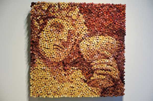 А Портрет из винных пробок здесь тот же самый Скотт Гендерсон создал изображение женщины, живущей в Руанде. На этот портрет пошло уже 9200 пробочек и 50 часов времени. Одних только гвоздей для крепления материала потребовалось около 17 000.