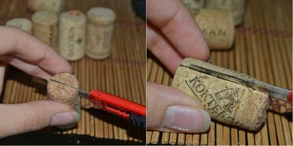 Для экономии и упрощения приклеивания, пробки стоит предварительно разрезать пополам по длине.