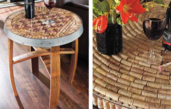 Стол из пробок однозначно требует рук из плеч и подходящего стекла для защиты поверхности. Зато результат может превзойти все ожидания — такой аксессуар точно не останется без внимания. Можно использовать старый журнальный столик и сверху обклеить его пробками. Или сколотить «основу» самому из досок из строительного магазина.