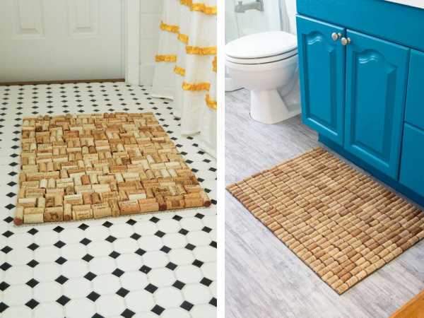Коврик для ванной также просто сделать своими руками. Вам понадобится тонкий готовый коврик в качестве подстилки, водостойкий клей и пробки. Их можно разрезать канцелярским ножом вдоль для большего сцепления или приклеивать целиком. Как мы помним, пробка влагоустойчива и не подвержена гниению, а это несомненный плюс для аксессуара в ванной комнате.