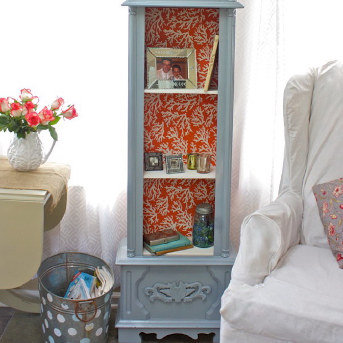 Можно задекорировать не только задние стенки шкафа или стеллажа, но и всю его «внутренность» — если хочется кардинальных изменений. Смотрится очень стильно и необычно!