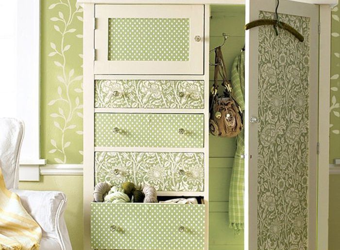 После ремонта остаются обрезки обойных полотен. Их можно использовать для оклейки платяного шкафа. Это — один из способов декорирования потерявших былой лоск мебельных предметов.