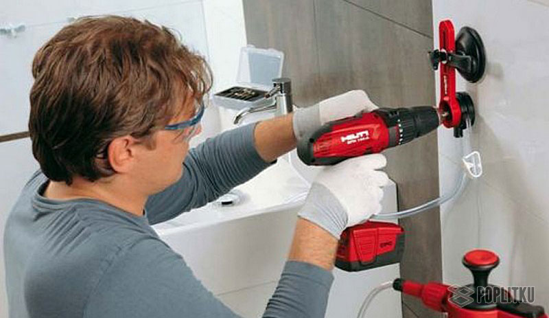 - Перфоратор в ударном режиме отпадает сразу, а вот при переключении на «дрель» он вполне годится для сверления кафеля. Кроме того, для дальнейшей подготовки гнезда под крепеж уже в бетонной стене понадобится именно он, так что все работы можно будет выполнить одним инструментом.