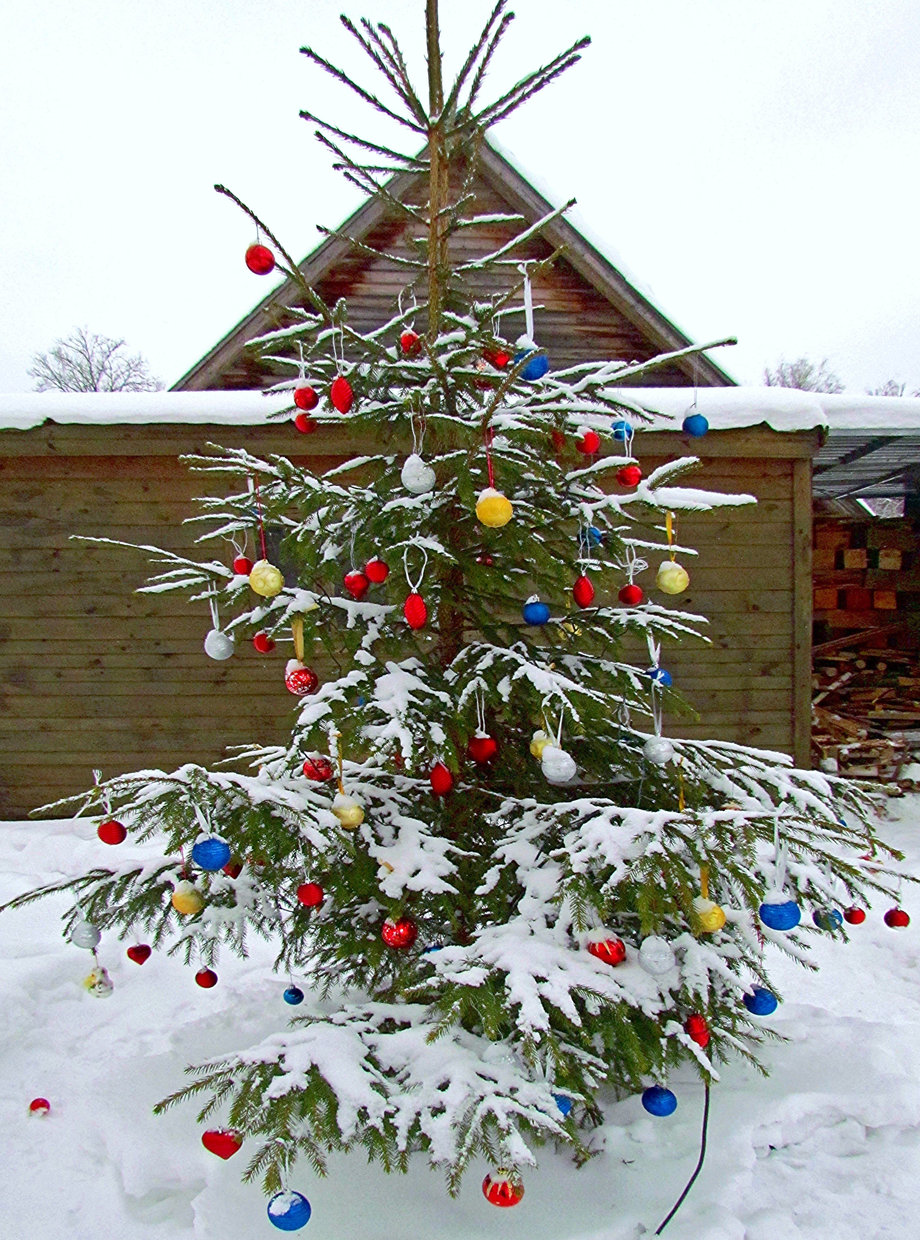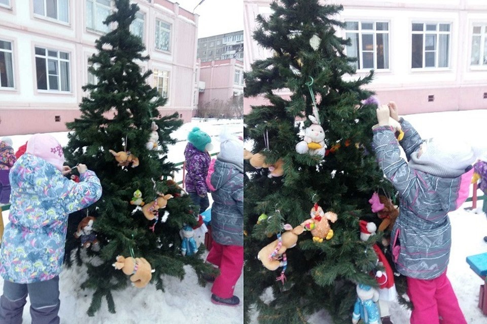 Украшения для новогодней елки во дворе могут быть самыми разными.