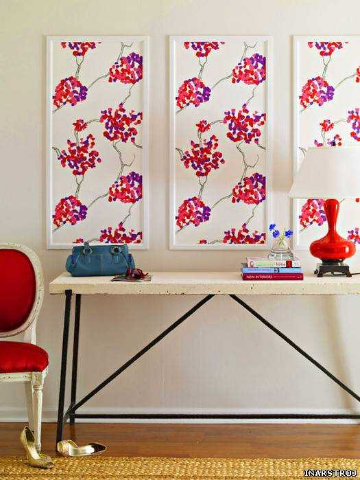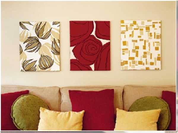 Картины из ткани помогут украсить комнату, придав ей завершенность. Очень хорошо будет смотреться композиция из нескольких картин с разными тканями, но общим цветом в каждой из них. Такие картины можно сделать, как из одного куска ткани, так и из отдельных лоскутков. Если у вас есть кусочек ткани с крупным рисунком, то из него можно сделать несколько картин и повесить в виде композиции. Картины в таком случае необходимо создавать одинакового размера, и необязательно их вешать друг к другу близко. Некоторая отдаленность придаст такой композиции особый шарм.