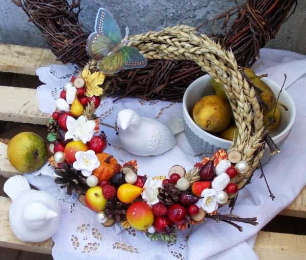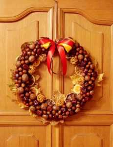 Летом используются полевые цветы: декоративные подсолнухи, васильки, ромашки. Еще можно делать веночки из ягод, из малиновых веточек, вишен, клубники. Осенью можно вязать из ярких листьев, смешивать все оттенки осени и приносить их в дом. Брать шишки, желуди, осенние цветы и творить. А зимой можно создавать из елочных украшений, из вырезанных снежинок, шишек, дождиков и бус.