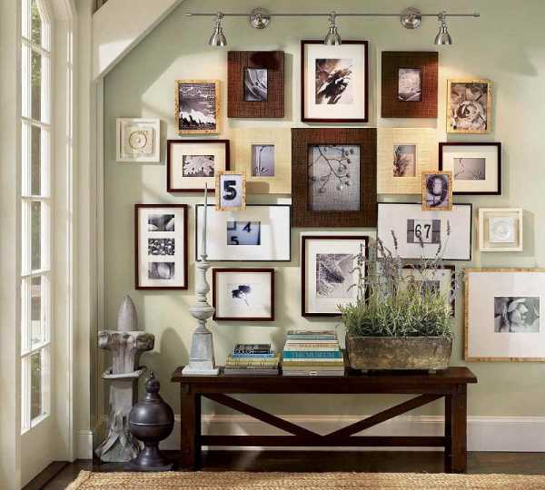 - оригинальное расположение фотографий и зеркал в интересных рамках;
