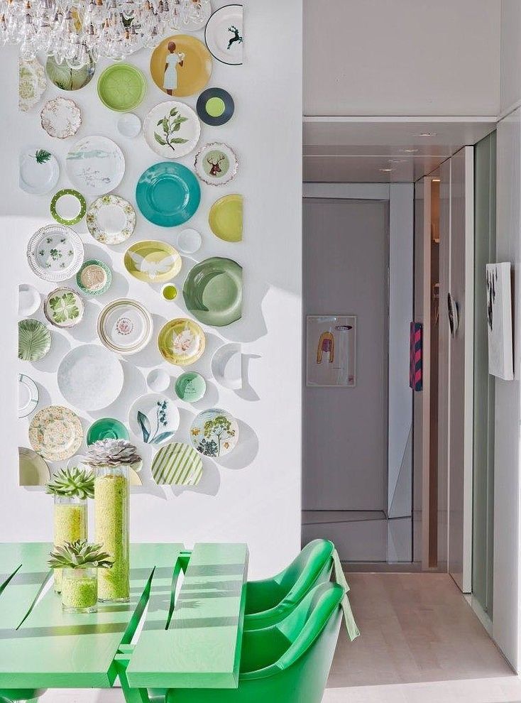 На кухне или в столовой стену можно оформить декоративными тарелками и кухонной утварью. Но тут нужно быть осторожнее с цветом. Собирая композицию, подбирайте перекликающиеся по цвету элементы — например, сочетайте белую керамику с серебряными элементами, которые, кстати, прекрасно гармонируют с оттенками светлого дерева.