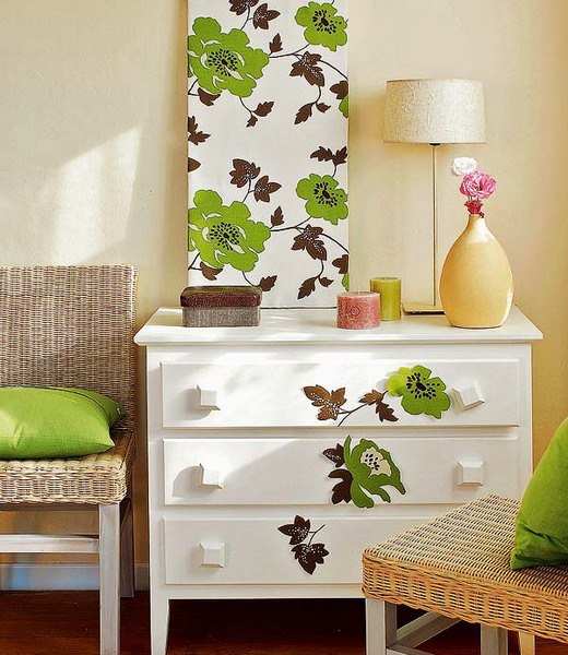 При наличии красок разного цвета, не обязательно окрашивать всю поверхность в скучный однотонный оттенок. Применяя разные шаблоны можно создать неординарные орнаменты.