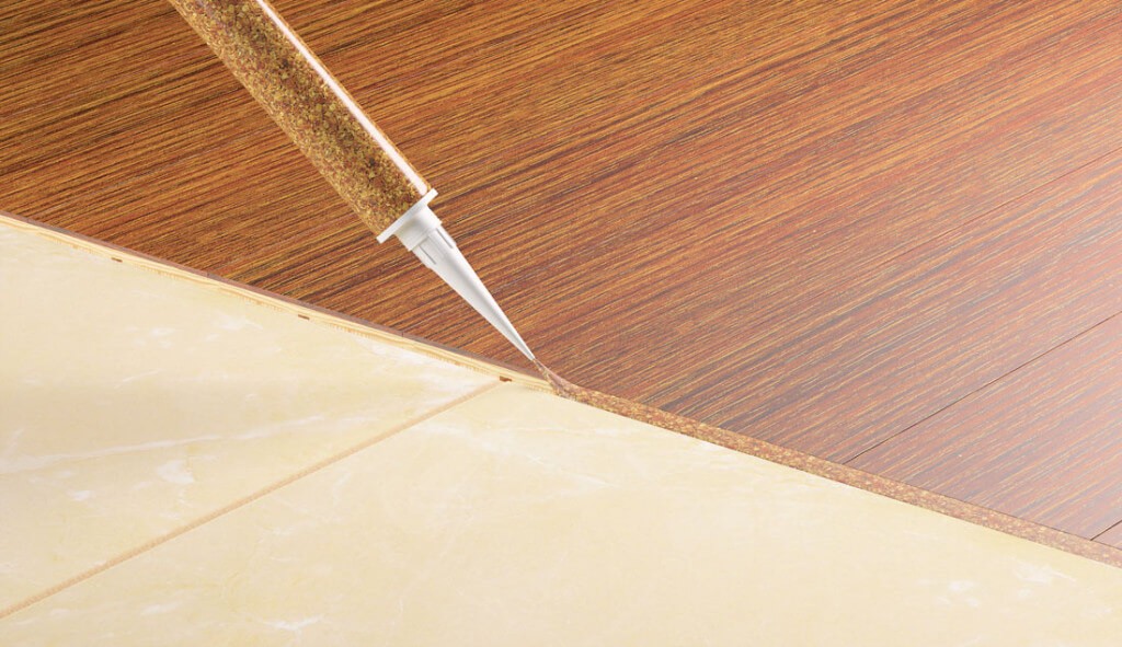 Если не оставить маленький зазор в месте стыковки, целостность покрытия вскоре нарушится. Чтобы не было щели, в пространство между ламинатом и плиткой укладывают наполнитель.