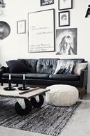 Интерьер гостиной в стиле лофт украшает большой постер с чёрно-белой фотографией очаровательной Одри Хепберн. Постер идеально смотрится прислонённым к кирпичной стене на оригинальном комоде.