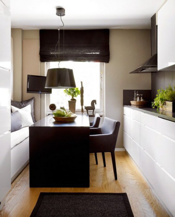 С тремя белыми стенами и одной черной даже самая маленькая кухня покажется шире и больше.