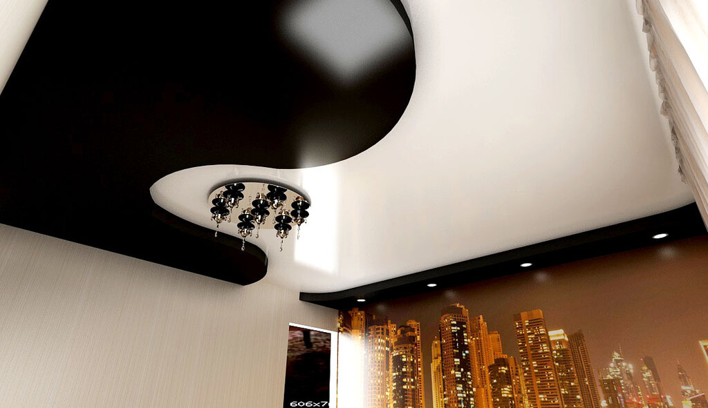 Нередко встречаются и натяжные потолки, которые состоят из нескольких уровней разных цветов. Особенно стильно смотрится контрастное черно-белое сочетание. Еще один прекрасный вариант – темный потолок, украшенный золотыми или серебристыми вставками.