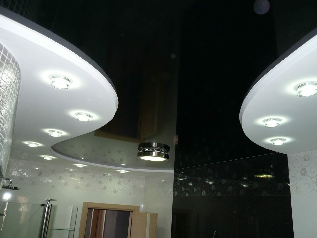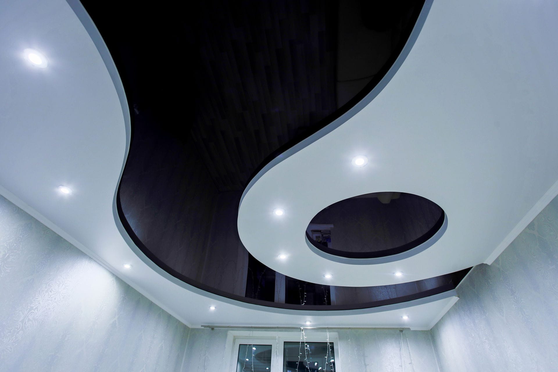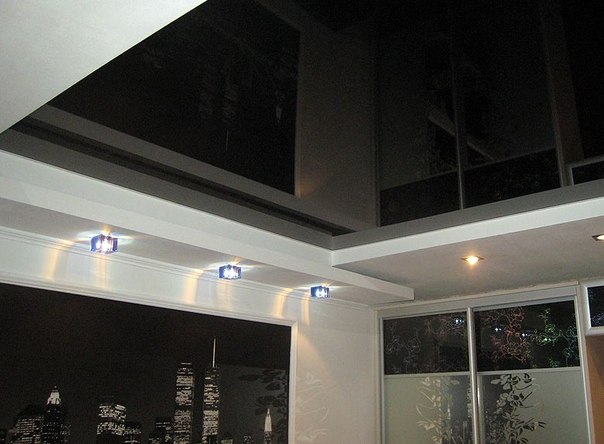 Черный навесной потолок фото: Черный глянцевый натяжной потолок в интерьере спальни, гостиной